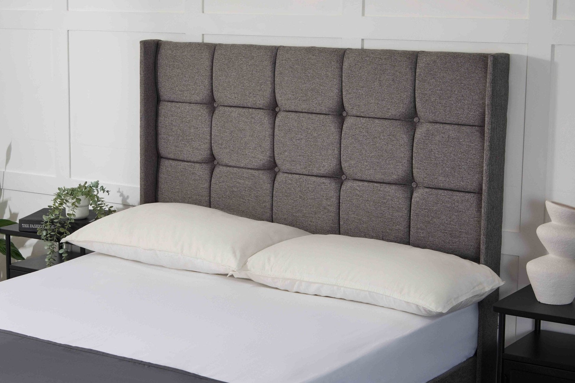 Tall button-tufted panel headboard for a bold, luxurious bedroom centrepiece